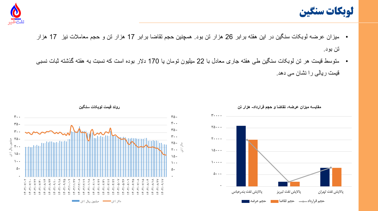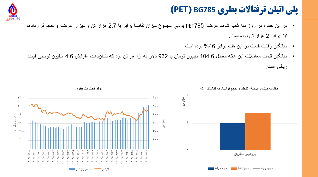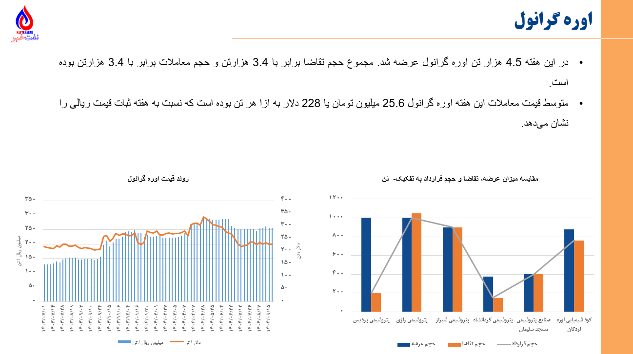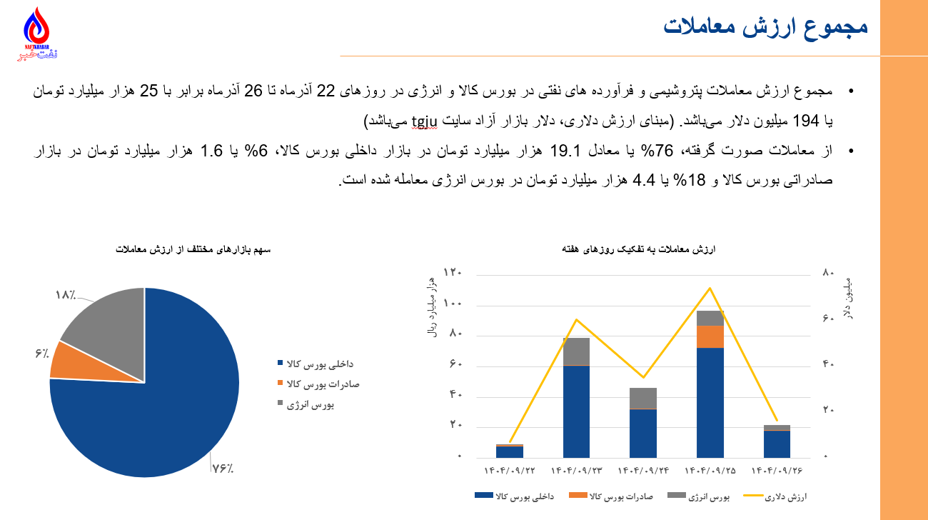 •مجموع ارزش معاملات پتروشیمی و فرآورده های نفتی در بورس کالا و انرژی در روزهای 22 آذرماه تا 26 آذرماه برابر با 25 هزار میلیارد تومان یا 194 میلیون دلار میباشد. (مبنای ارزش دلاری، دلار بازار آزاد سایت tgju میباشد)