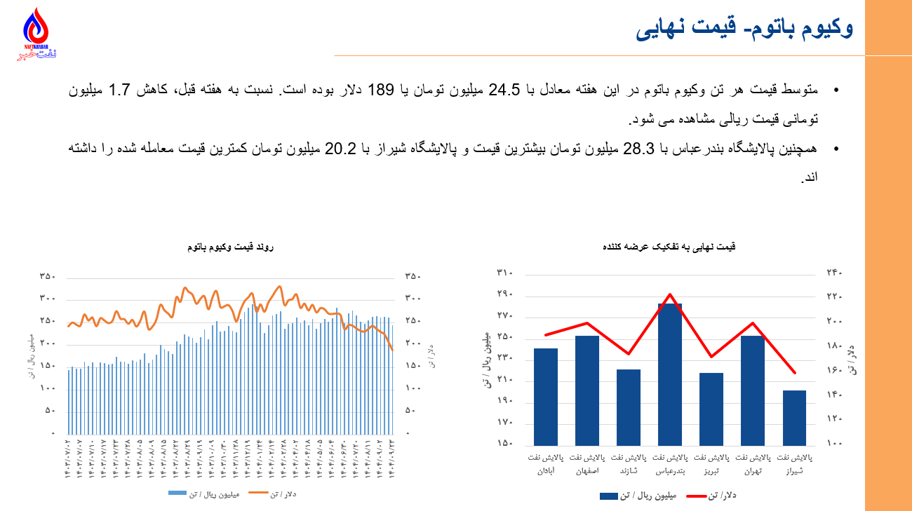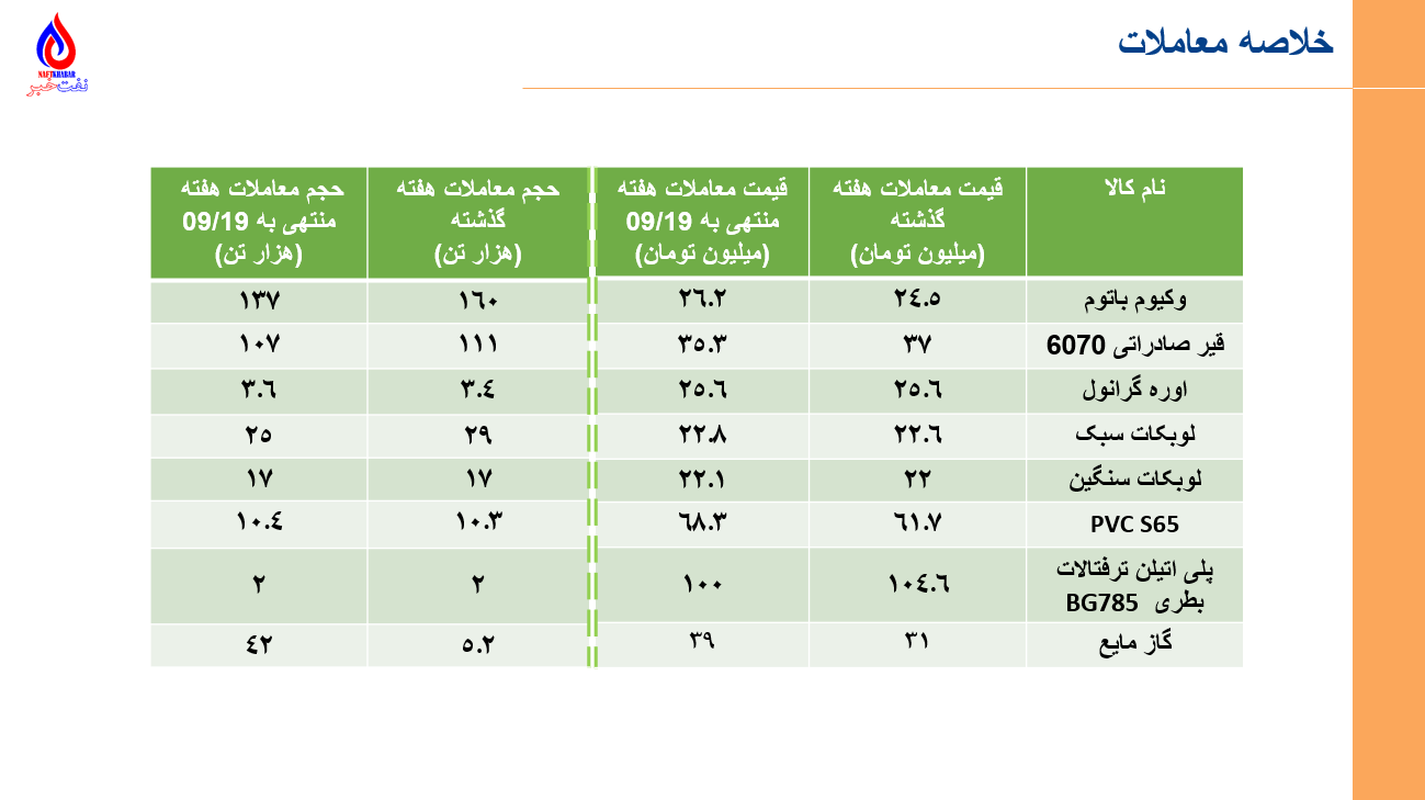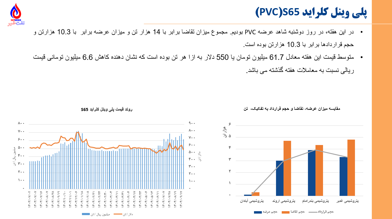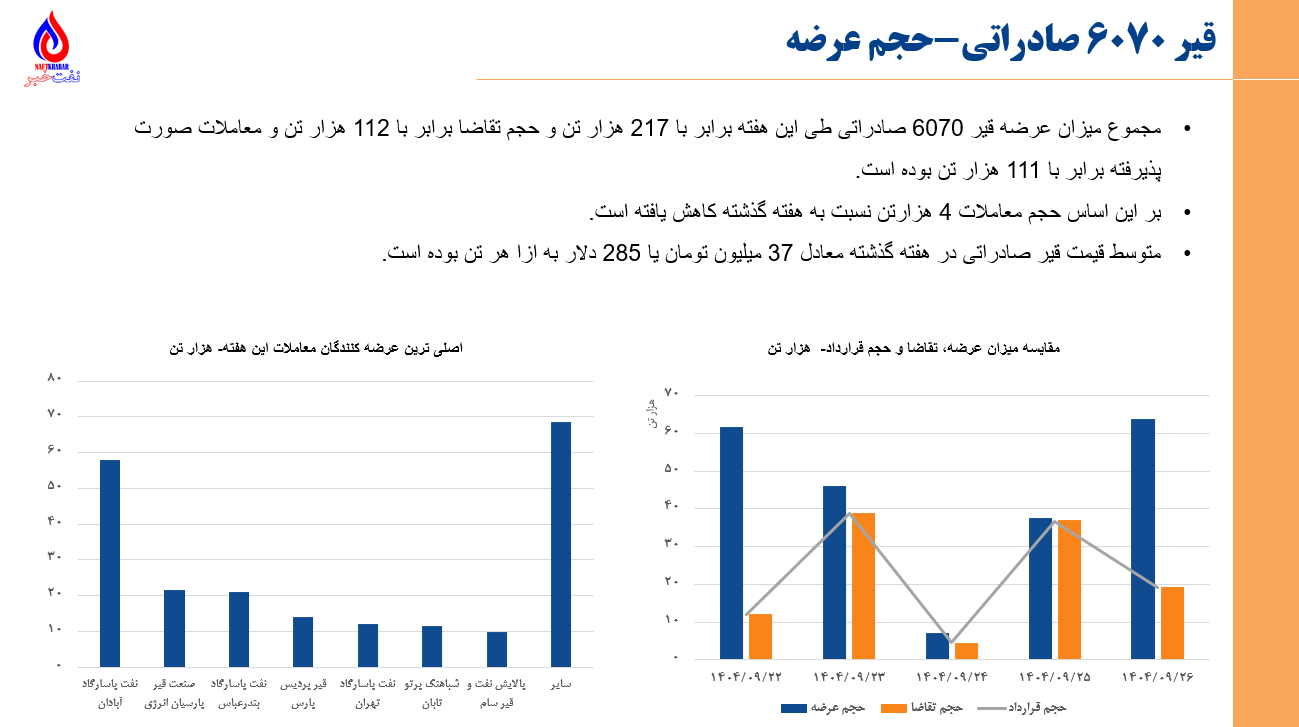 •مجموع ارزش معاملات پتروشیمی و فرآورده های نفتی در بورس کالا و انرژی در روزهای 22 آذرماه تا 26 آذرماه برابر با 25 هزار میلیارد تومان یا 194 میلیون دلار میباشد. (مبنای ارزش دلاری، دلار بازار آزاد سایت tgju میباشد)