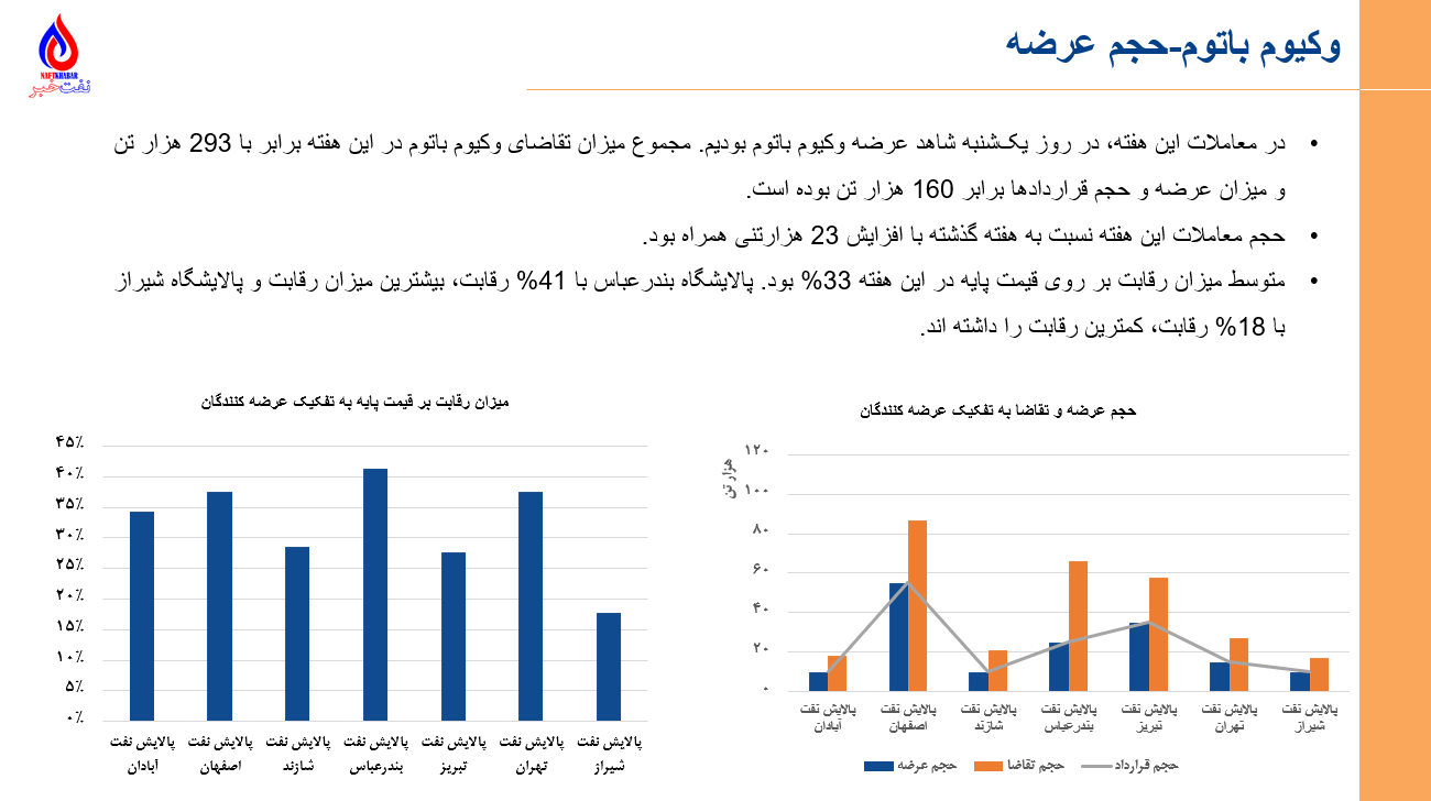 •از معاملات صورت گرفته، 76% یا معادل 19.1 هزار میلیارد تومان در بازار داخلی بورس کالا، 6% یا 1.6 هزار میلیارد تومان در بازار صادراتی بورس کالا و 18% یا 4.4 هزار میلیارد تومان در بورس انرژی معامله شده است.