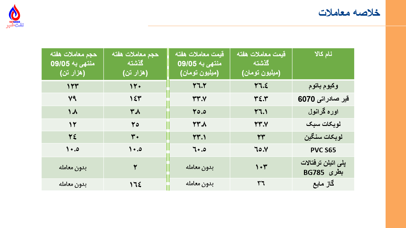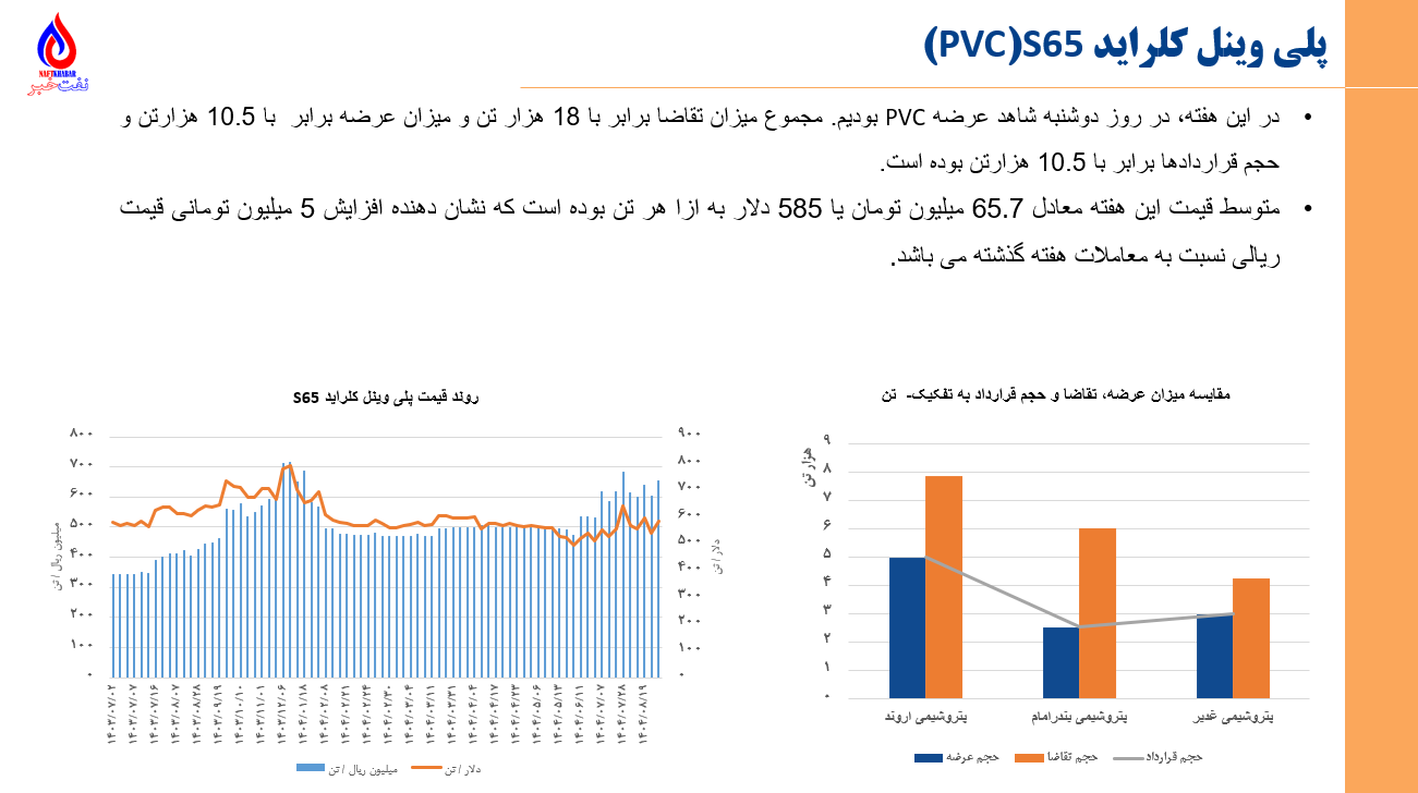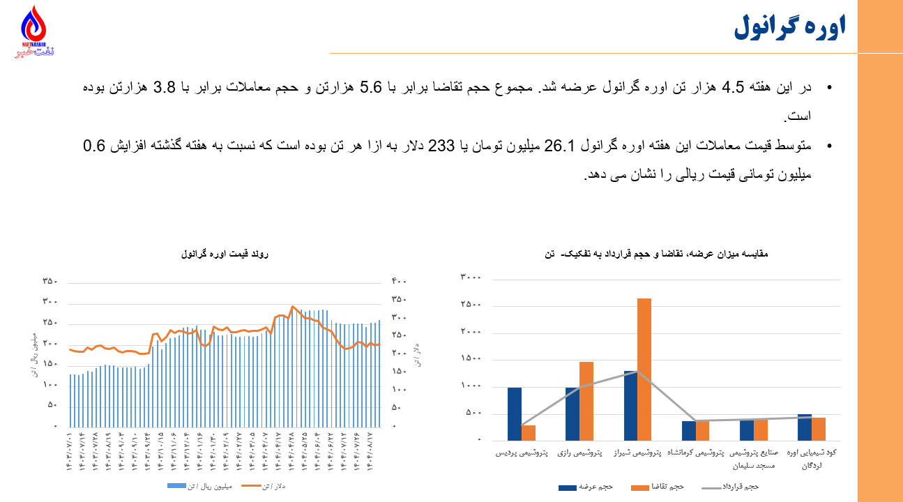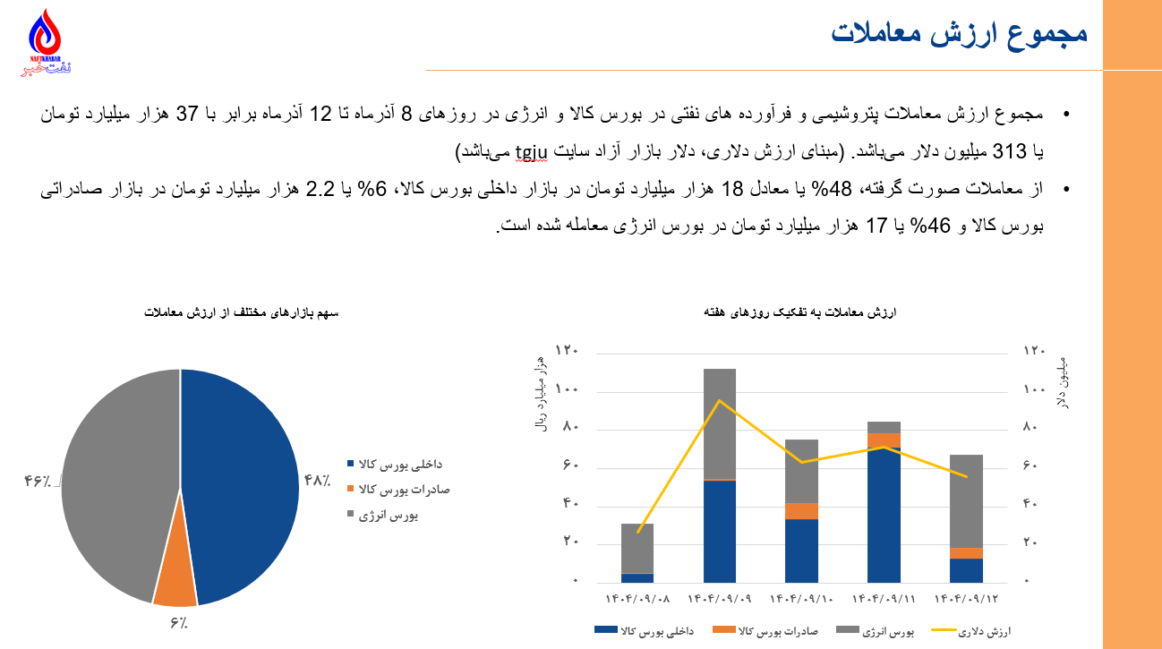 •مجموع ارزش معاملات پتروشیمی و فرآورده های نفتی در بورس کالا و انرژی در روزهای 8 آذرماه تا 12 آذرماه برابر با 37 هزار میلیارد تومان یا 313 میلیون دلار میباشد. (مبنای ارزش دلاری، دلار بازار آزاد سایت tgju میباشد)