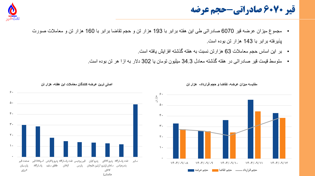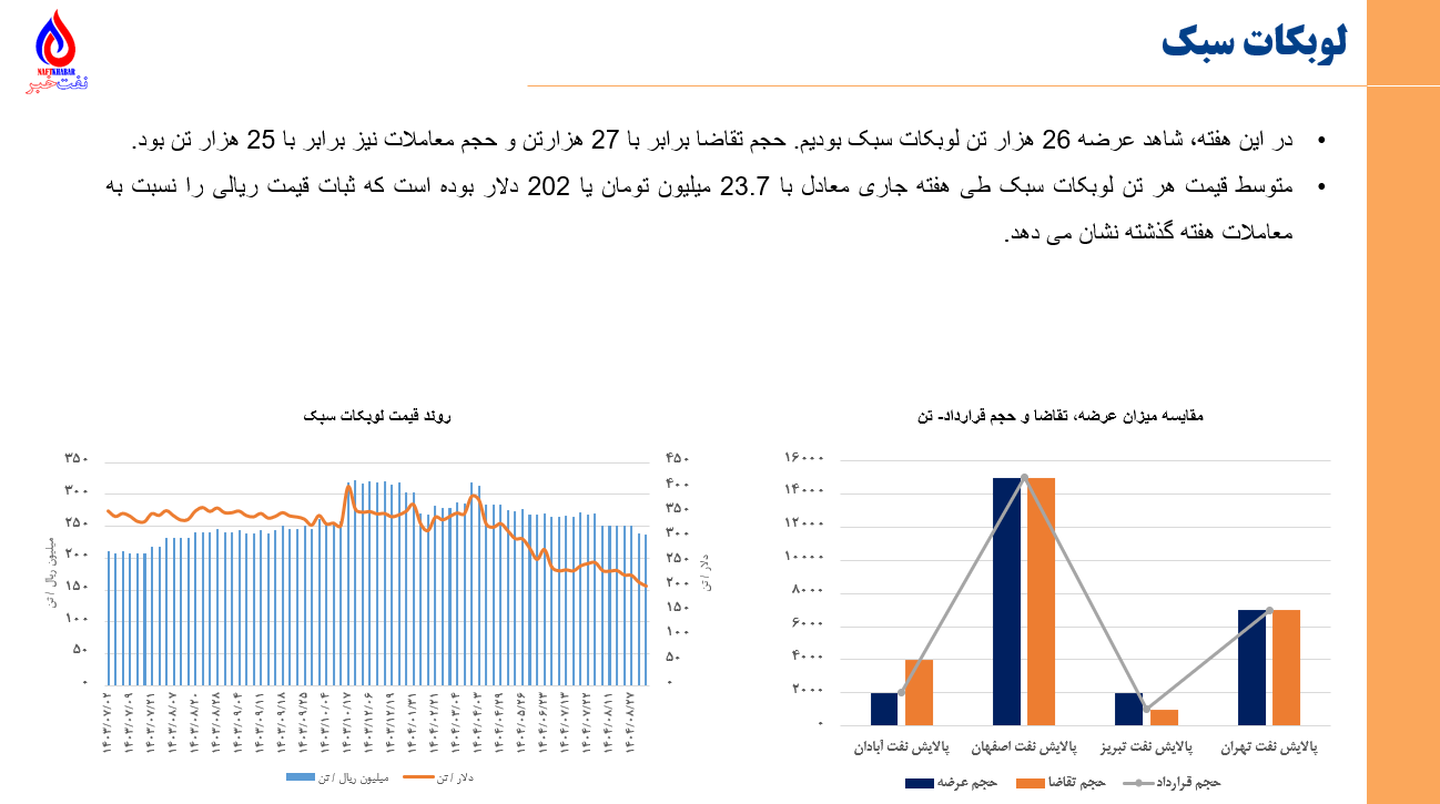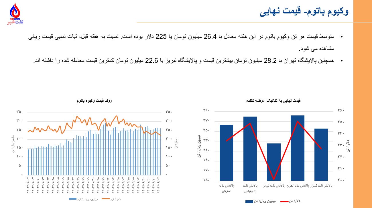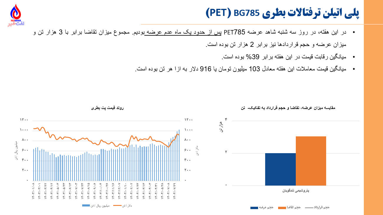 •مجموع ارزش معاملات پتروشیمی و فرآورده های نفتی در بورس کالا و انرژی در روزهای 8 آذرماه تا 12 آذرماه برابر با 37 هزار میلیارد تومان یا 313 میلیون دلار میباشد. (مبنای ارزش دلاری، دلار بازار آزاد سایت tgju میباشد)