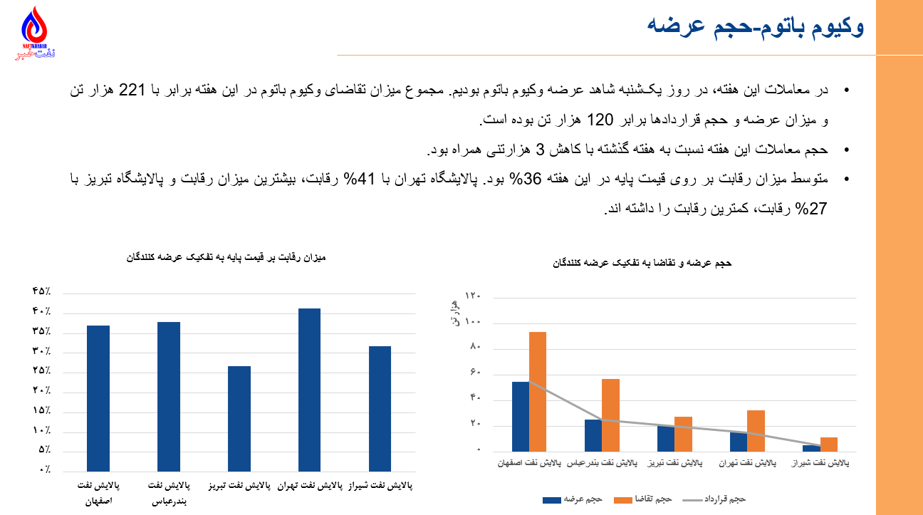 •از معاملات صورت گرفته، 48% یا معادل 18 هزار میلیارد تومان در بازار داخلی بورس کالا، 6% یا 2.2 هزار میلیارد تومان در بازار صادراتی بورس کالا و 46% یا 17 هزار میلیارد تومان در بورس انرژی معامله شده است.