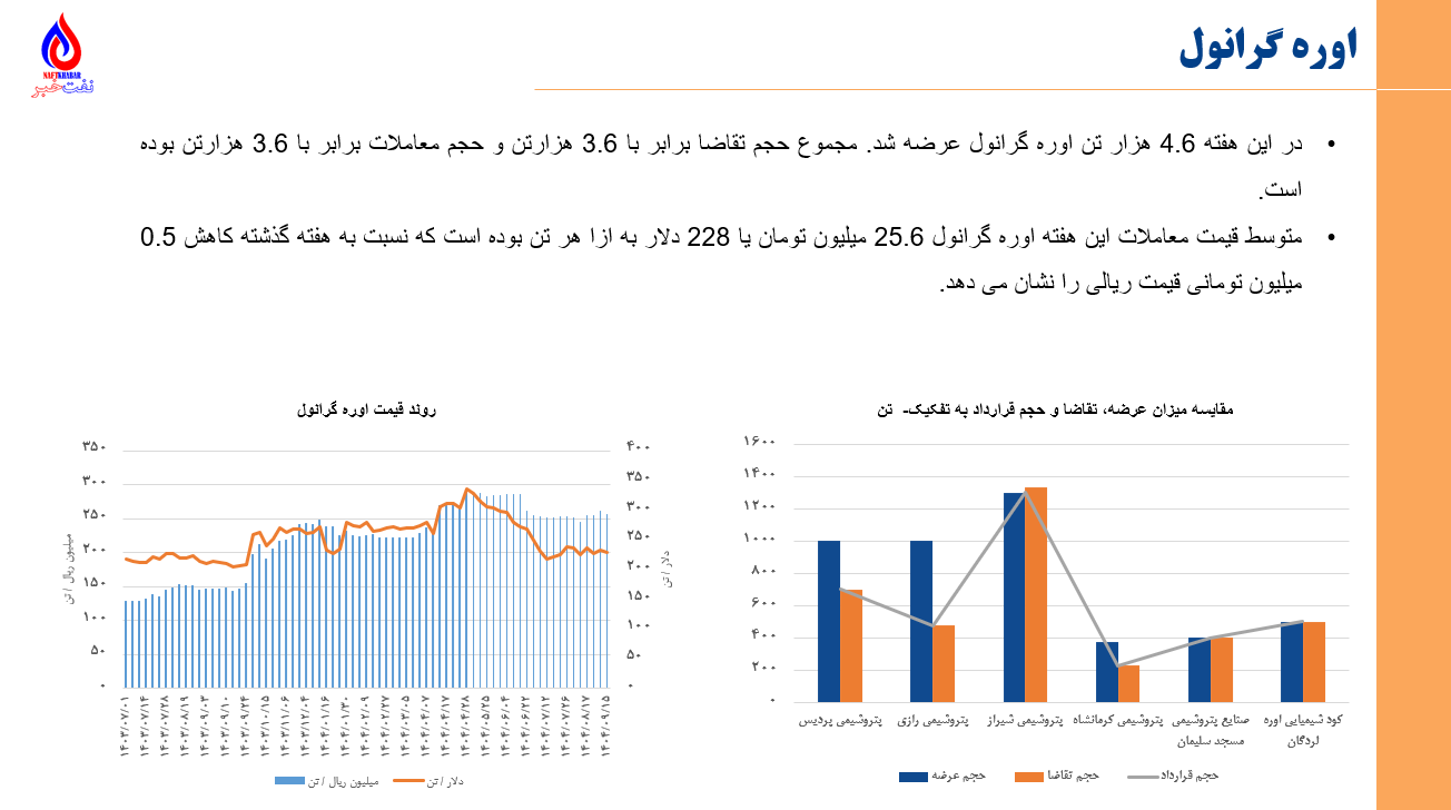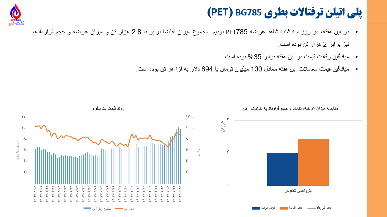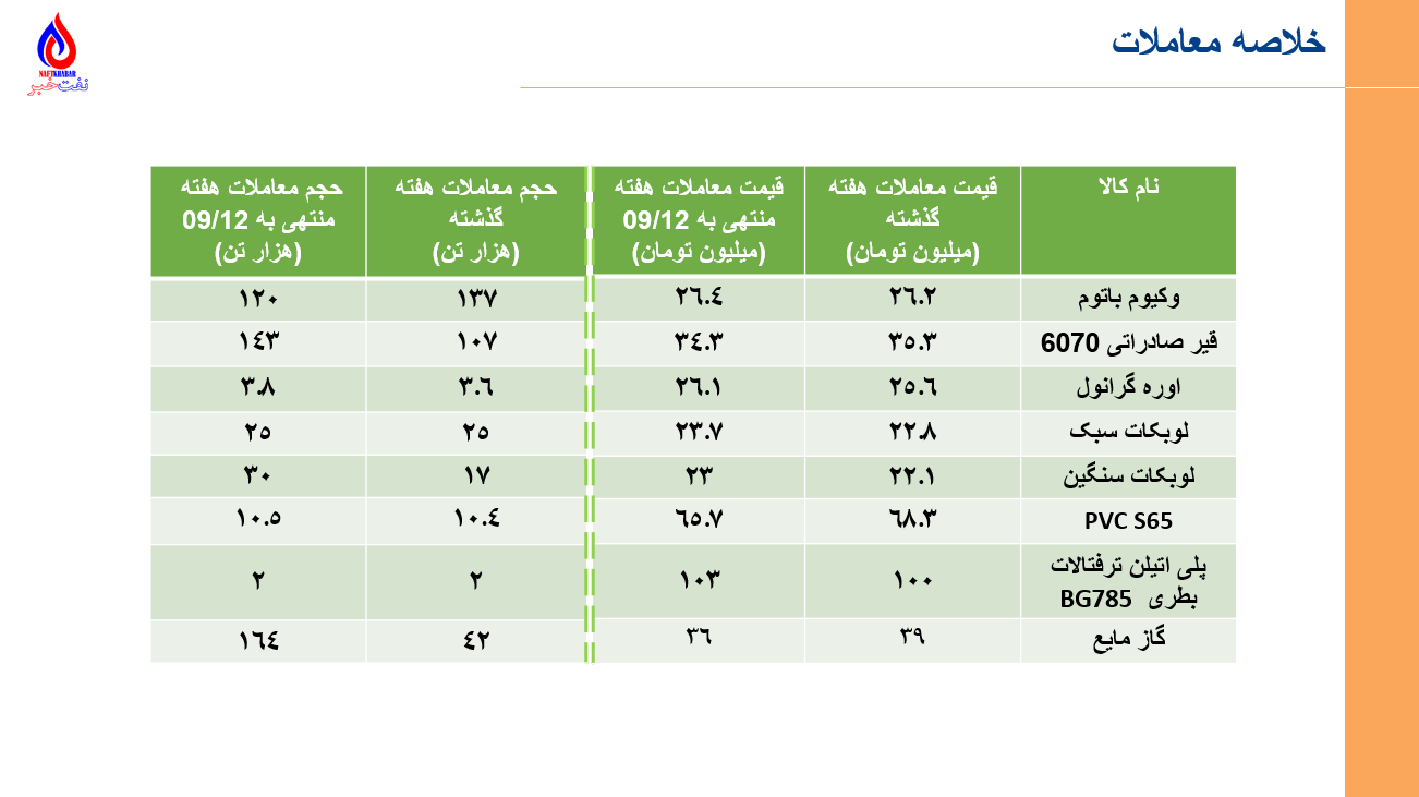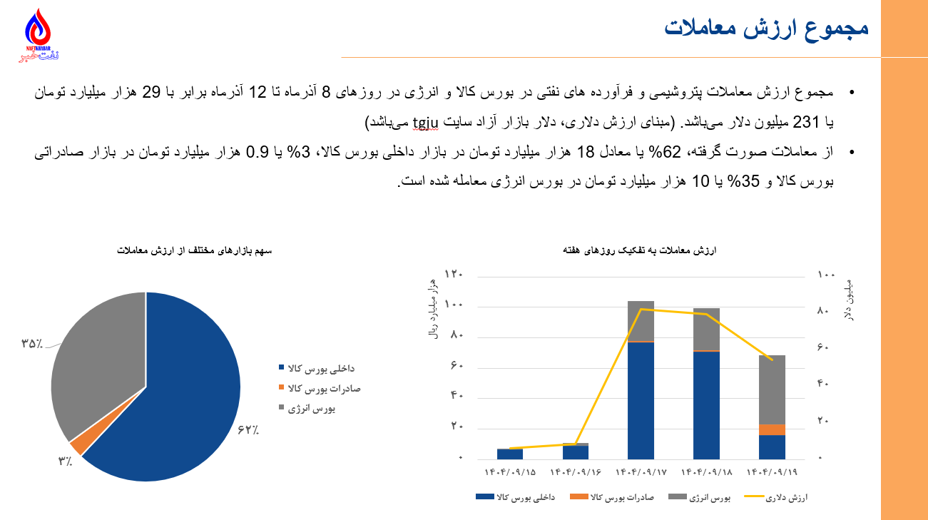 •مجموع ارزش معاملات پتروشیمی و فرآورده های نفتی در بورس کالا و انرژی در روزهای 8 آذرماه تا 12 آذرماه برابر با 29 هزار میلیارد تومان یا 231 میلیون دلار میباشد. (مبنای ارزش دلاری، دلار بازار آزاد سایت tgju میباشد)