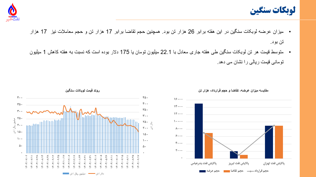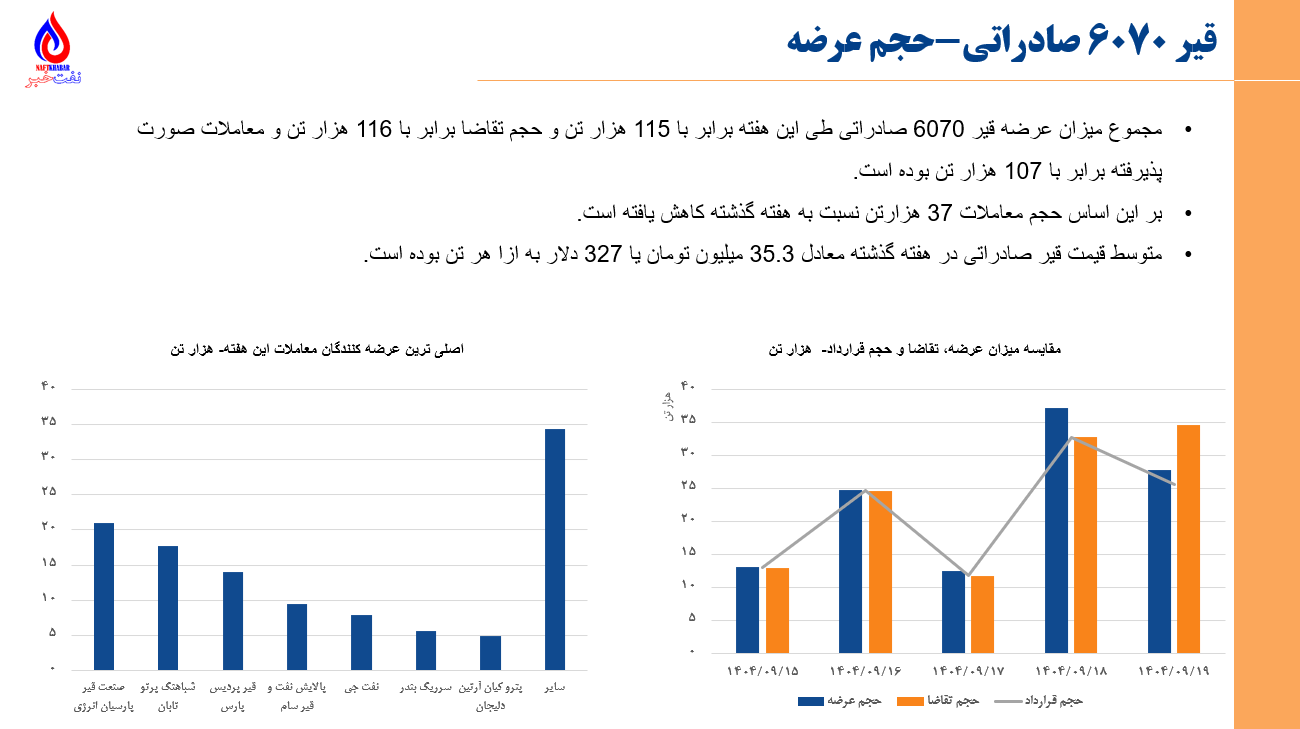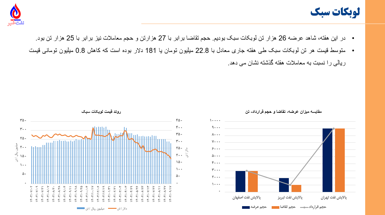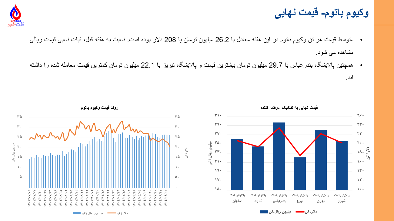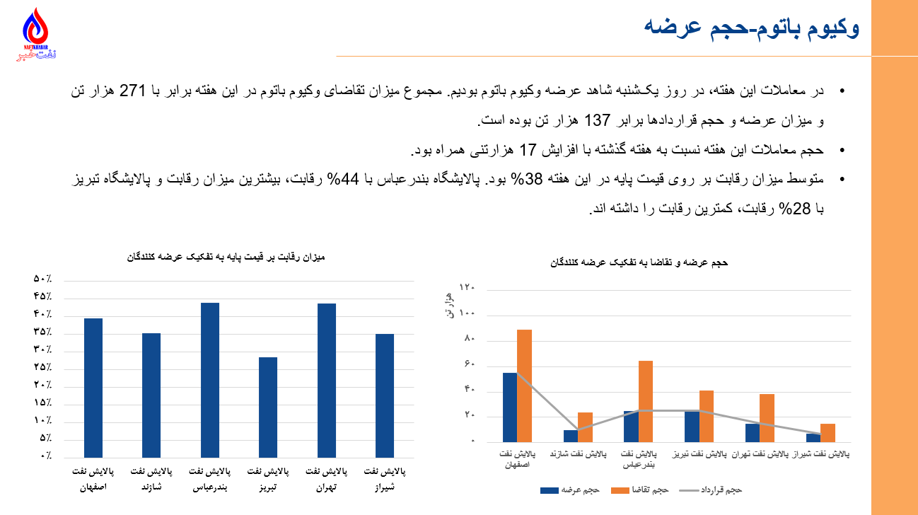 •مجموع ارزش معاملات پتروشیمی و فرآورده های نفتی در بورس کالا و انرژی در روزهای 8 آذرماه تا 12 آذرماه برابر با 29 هزار میلیارد تومان یا 231 میلیون دلار میباشد. (مبنای ارزش دلاری، دلار بازار آزاد سایت tgju میباشد)